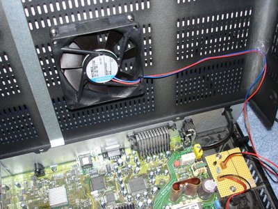 Der Artikel beschreibt die Senkung der Umgebungsluft innerhalb der DBox2 durch den Einsatz eines Lüfters.
